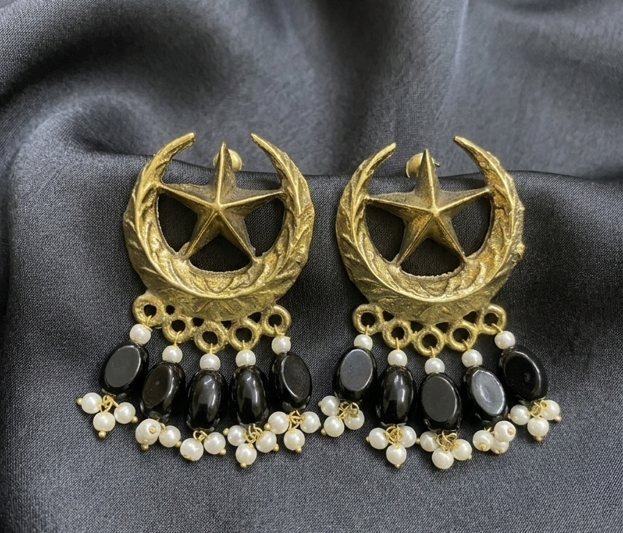 The Crescent Star Earrings are a poetic fusion of ancient symbolism and modern sophistication. At the heart of each earring sits a meticulously sculpted crescent moon cradling a five-pointed star, finished in a rich, textured gold that exudes vintage charm. The design is further elevated by a cascading fringe of deep black onyx-style beads and petite white pearls, creating a rhythmic movement that captures the eye. These earrings are designed for those who seek to add a touch of mystery and celestial wonder to their jewelry collection.