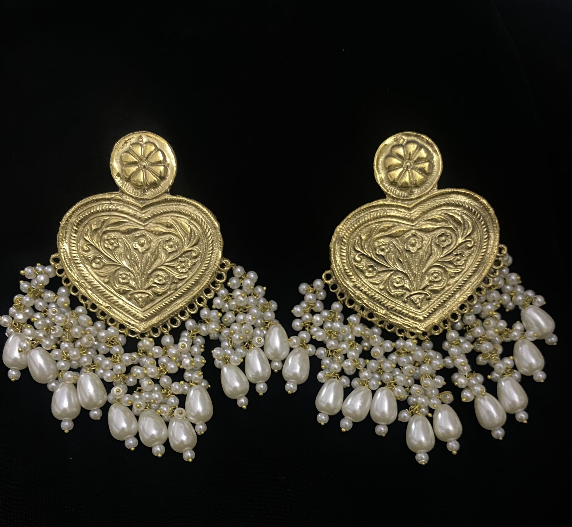 The Dil-Bagh Antique Heart Drops are a breathtaking fusion of romantic symbolism and heritage-inspired metalwork. At the center of each earring lies a beautifully sculpted heart, meticulously etched with rhythmic vines and blossoms that have been treated with a rich oxidized patina. This specialized antique finish darkens the recessed areas, ensuring that every artisanal detail stands out with sophisticated, “old-world” character. The warm gold tone is elegantly balanced by a cascading cloud of luminous pearls, providing a soft contrast to the bold, structured metalwork. Whether you are dressing for a wedding or looking to elevate a modern silhouette with a touch of classic soul, these earrings serve as a definitive masterpiece of elegance.