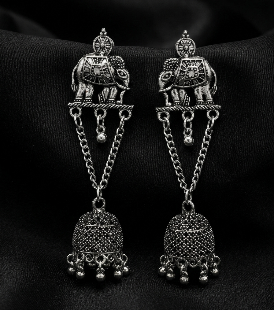 Capture the majesty of ancient heritage with these oxidized silver elephant jhumkas. These earrings feature a regal elephant stud, intricately detailed with traditional saddle patterns and crowned by a solar emblem. The elephant, a symbol of strength and wisdom, provides a bold and unique focal point.