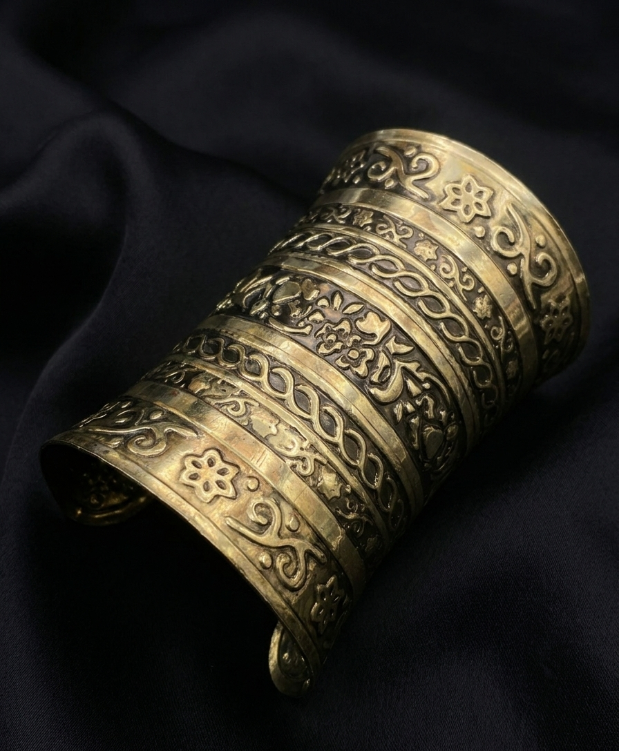The Heritage Embossed Brass Cuff is a masterpiece of timeless elegance, designed for those who appreciate the soul of handcrafted jewelry. This wide-profile cuff features a mesmerizing sequence of embossed bands, each showcasing a different intricate motif—from delicate blossoms to swirling celestial vines. The warm, golden-brass tone is enhanced by a professional oxidation process, creating a rich depth that makes the patterns pop against the darkened metal. Whether worn as a solo statement piece or as part of a regal festive ensemble, this cuff brings a sense of history and luxury to the modern wardrobe.