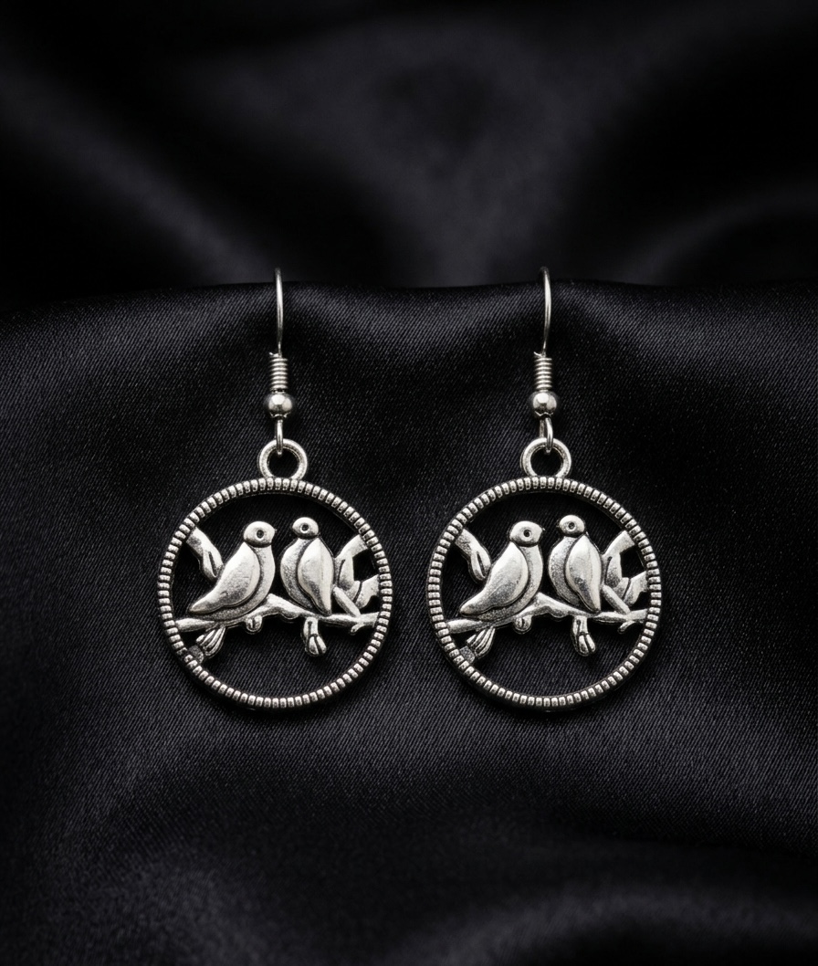 Design: Two birds on a branch within a textured circular frame.