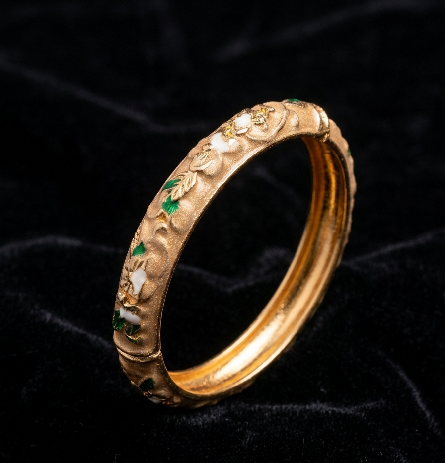 The Golden Meadow Enamel Bangle is a masterpiece of subtle elegance and nature-inspired design. Moving away from traditional high-shine finishes, this piece features a sophisticated matte-gold texture that serves as a canvas for its delicate botanical artistry. Hand-finished white enamel blossoms and deep green leaves are embossed across the surface, creating a beautiful 3D effect that celebrates the romantic essence of an autumn garden. Whether paired with a linen sundress or a structured evening look, this bangle adds an instant touch of artisanal luxury and feminine grace to your style.