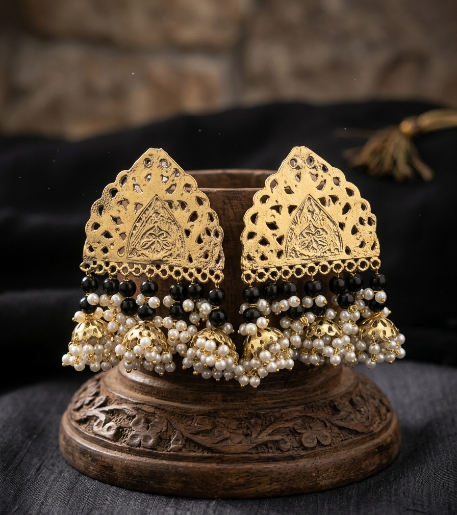 The Noir Heritage Chand Jhumkas are a sophisticated reimagining of classic tribal elegance. These statement earrings center around a majestic, archway-shaped stud that showcases intricate metal filigree and artisanal engraving. Below the gold-toned metalwork sits a rhythmic layer of black obsidian-toned beads and delicate white seed pearls, adding a bold “monochrome-luxe” contrast.