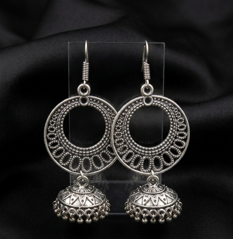 These exquisite oxidized silver-finish earrings bridge the gap between vintage charm and modern sophistication. Featuring a prominent circular filigree frame adorned with delicate beaded detailing, they culminate in a classic bell-shaped Jhumka drop.