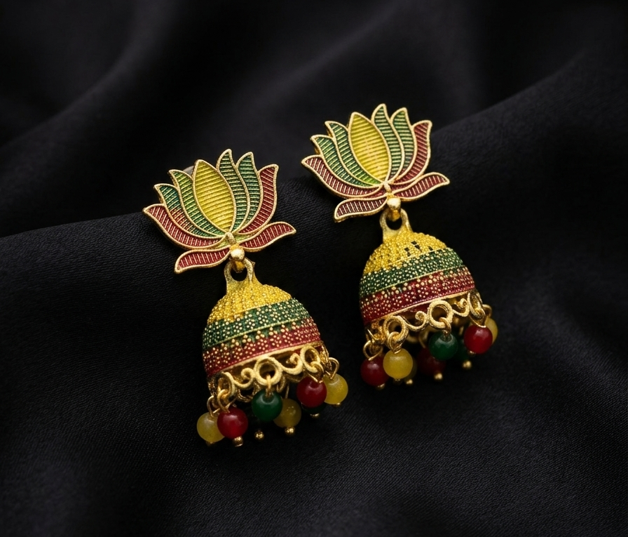 Step into a world of traditional charm with the Lotus Bloom Tricolor Jhumkas. These earrings are a masterpiece of ethnic design, drawing inspiration from the timeless beauty of the sacred lotus. Each piece is skillfully crafted with vibrant enamel inlays that transition beautifully from a warm yellow to deep green and rich red, mirroring the colors of a festive heritage.