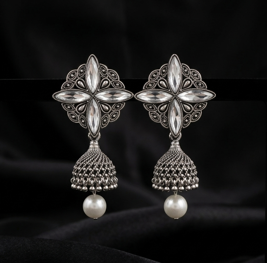 Experience a masterclass in balance and beauty. These oxidized silver jhumkas feature a striking four-point star stud, centered with a cross-formation of clear marquise-cut crystals. Each stone is framed by intricate floral metalwork, creating a brilliant focal point that reflects light beautifully.