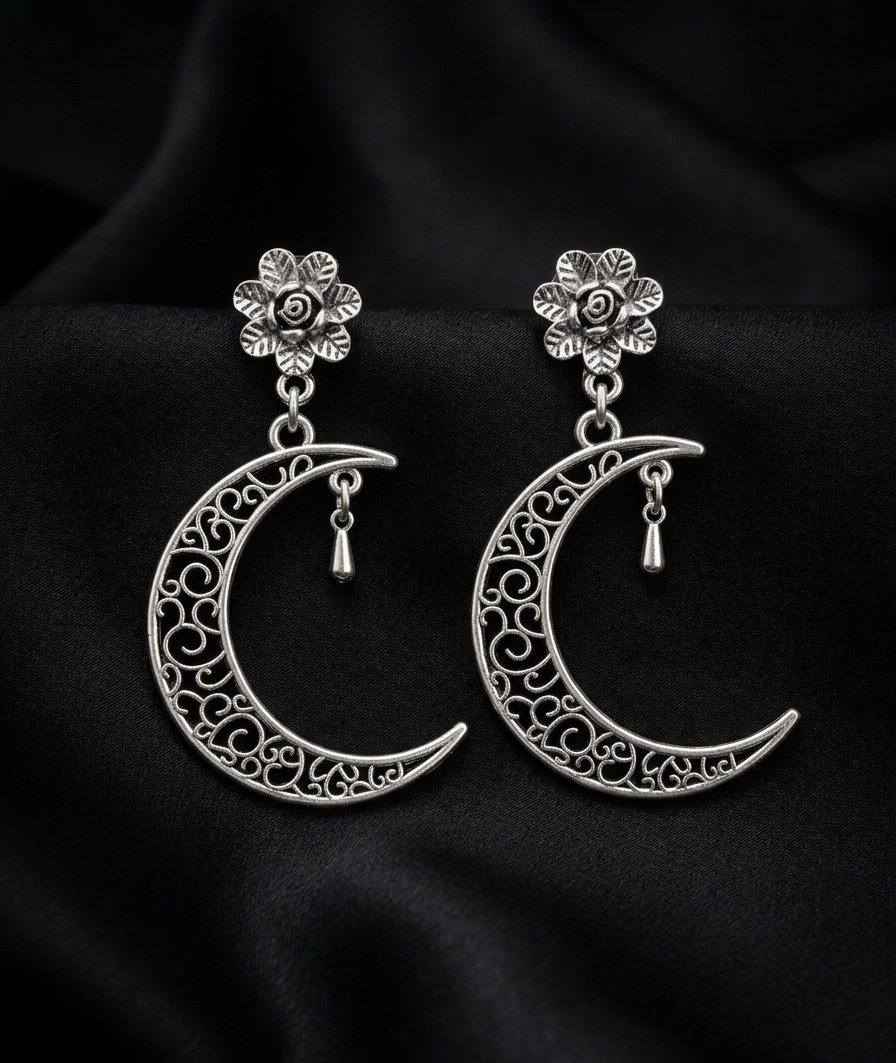 Capture the mystery of the night sky with these exquisitely crafted crescent moon earrings. Featuring a delicate floral stud that transitions into a wide, filigree-etched moon, these earrings are finished in a vintage oxidized silver tone.