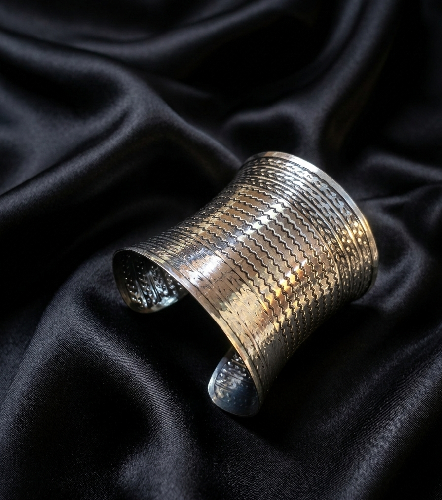 The Mini Silver Wave Statement Bangle captures the fluid elegance of moving water in a striking, monochromatic form. Its surface is adorned with a meticulously etched wavy pattern, creating a shimmering effect reminiscent of moonlight dancing on a calm sea. The cool silver tone and high-shine finish offer a sleek, architectural silhouette that feels both edgy and refined. Whether you’re pairing it with a leather jacket for a contemporary street-style look or using it to add a metallic edge to a formal gown, this cuff serves as the ultimate modern accessory.