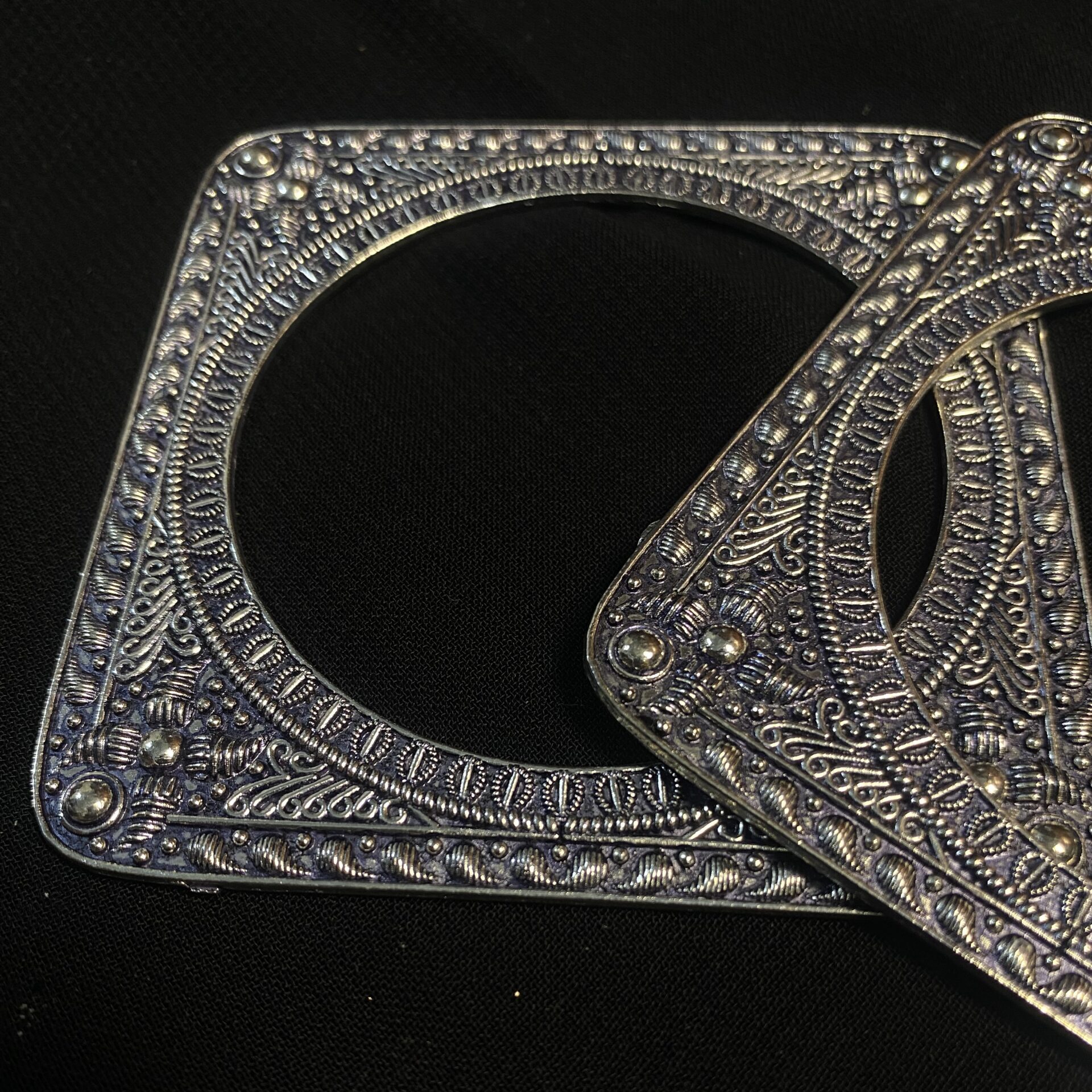 The Pair of Quad Bangles are a masterclass in structural elegance and artisanal detail. By pairing a classic rounded interior with a sharp, square exterior, these bangles offer a dramatic visual contrast that is both contemporary and deeply rooted in heritage. The surface is meticulously adorned with rhythmic floral patterns and raised metallic beads, reminiscent of vintage royal jewelry. Whether worn as a solo statement piece or stacked with silver chains, these bangles are designed for the modern jewelry lover who appreciates architectural silhouettes with a soulful, antique touch.