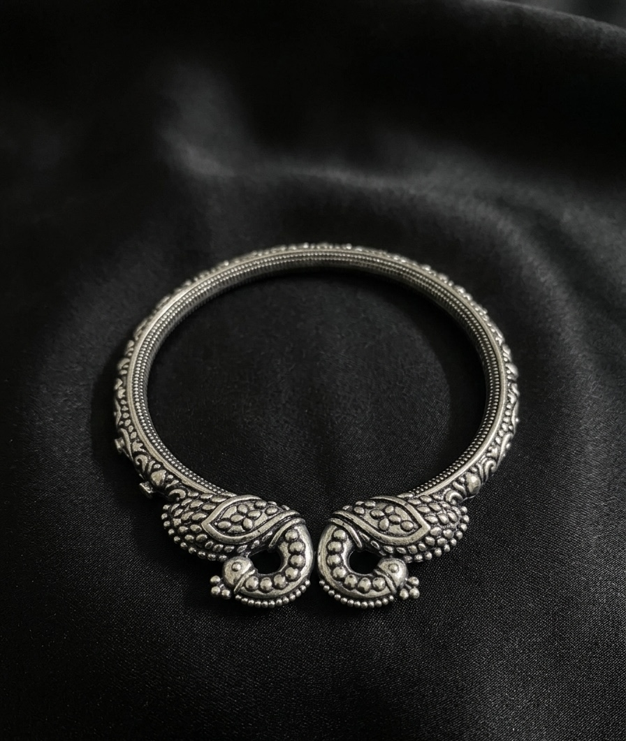 Design: Dual peacock “Mayur” terminals on a structured open cuff.