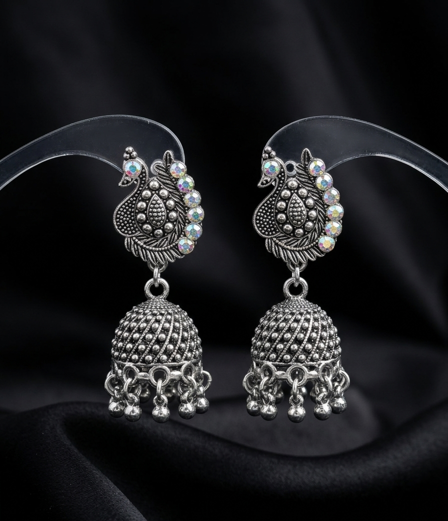 Embrace timeless elegance with these exquisitely crafted oxidized silver jhumkas. Featuring a regal peacock motif at the stud, these earrings are intricately detailed with traditional metalwork and accented by a crescent of iridescent, multi-tonal crystals that catch the light with every movement.