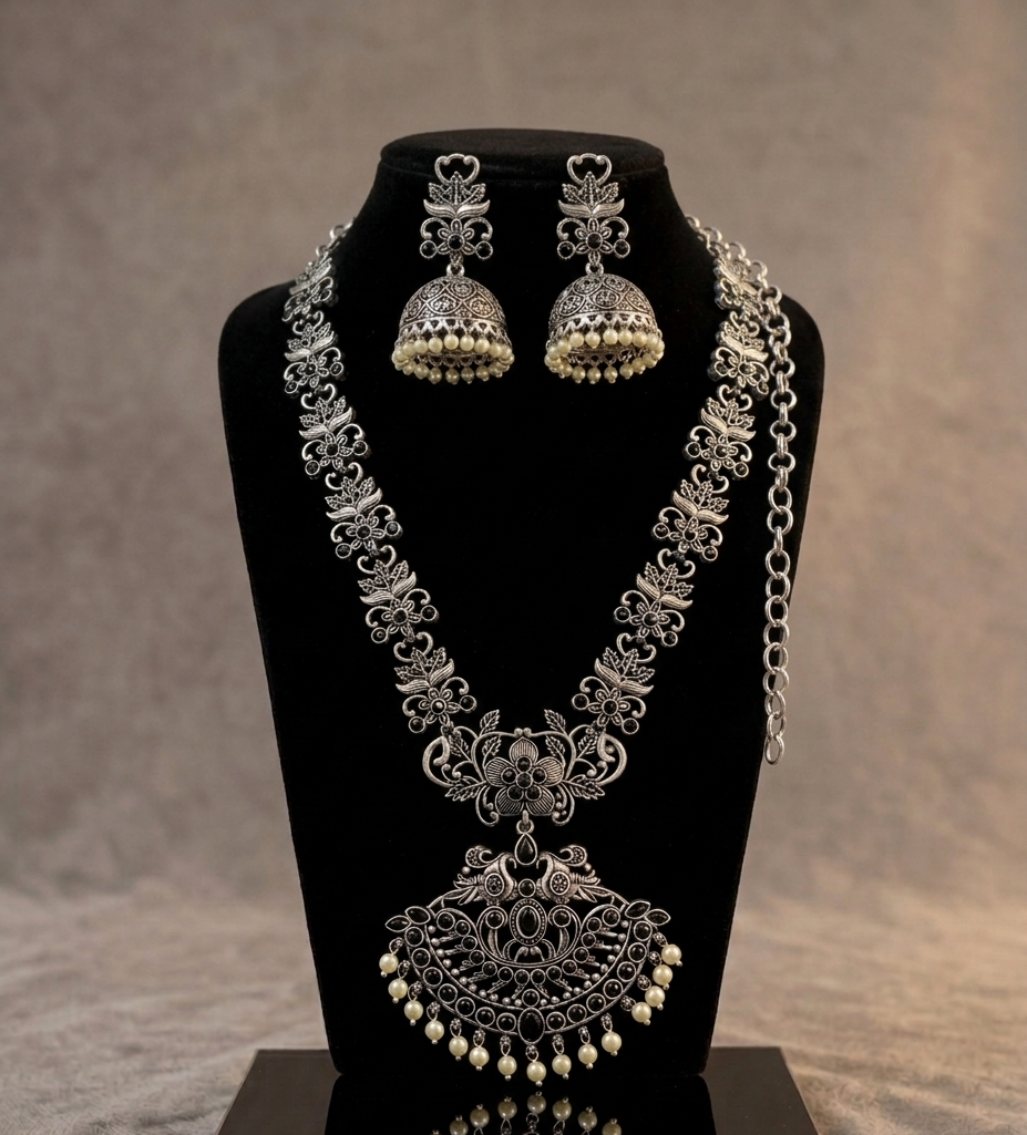Design: Long “Haar” style necklace with matching bell-shaped “Jhumkas.”