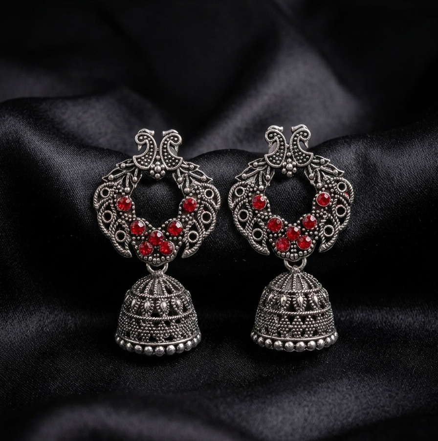 Command attention with these masterfully detailed oxidized silver jhumkas. These earrings feature a unique circular filigree stud, intricately woven with floral and leaf motifs and crowned by a dual-peacock crest. The design is brought to life by brilliant ruby-red crystals that add a vibrant pop of color and a touch of regal charm.