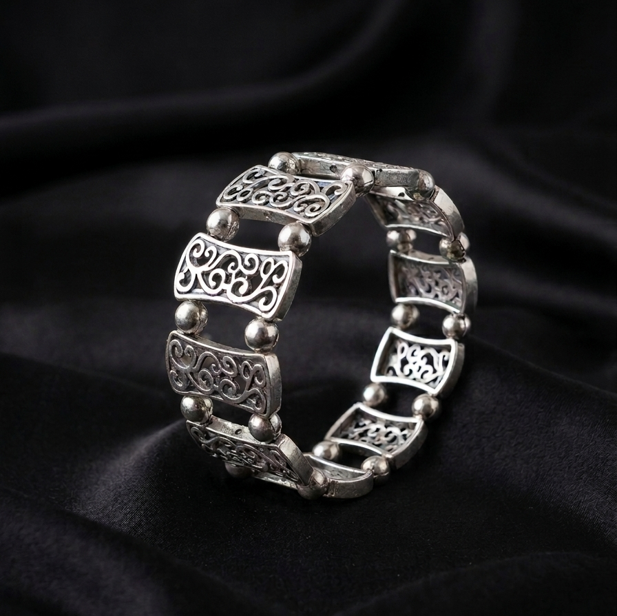 Craftsmanship: Fine open-cut metalwork joined by polished spherical accents.