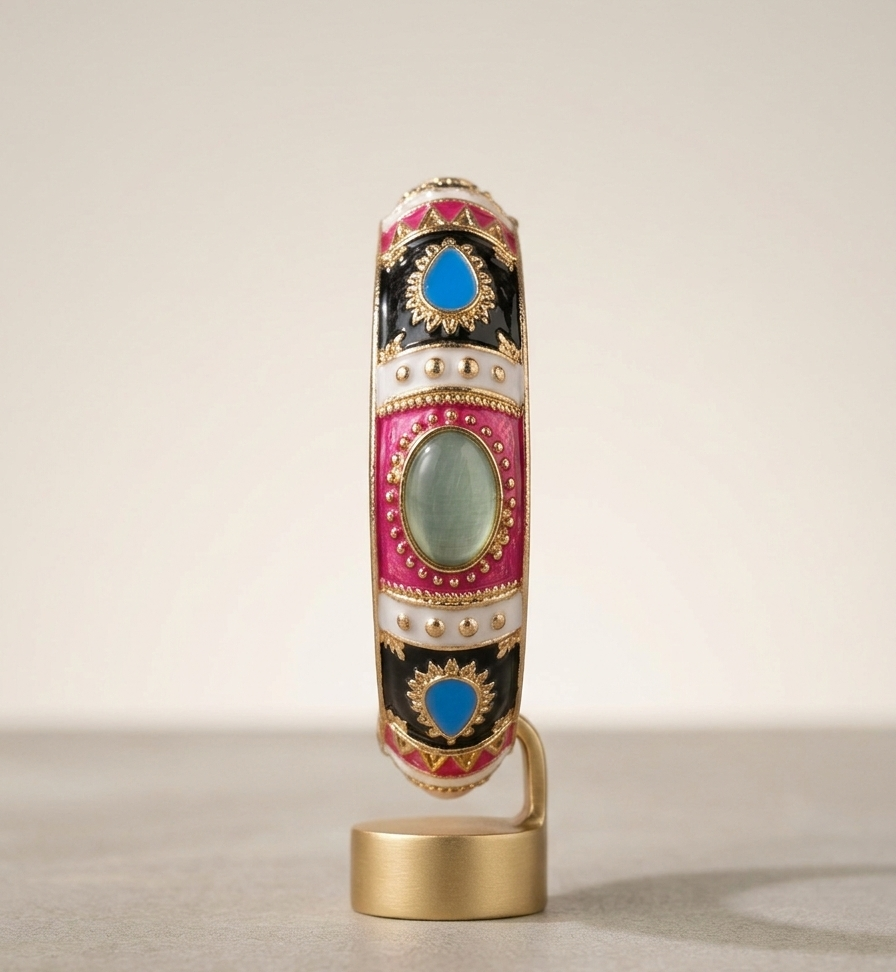 The Turquoise-Jewel Artisan Bangle is the ultimate statement in contemporary regal design. This non-adjustable piece breaks away from traditional palettes, utilizing a high-contrast combination of vibrant magenta and deep black enamel. The centerpiece is a soothing, mint-green cabochon set in a radiant gold sunburst frame, flanked by electric-blue turquoise inlays. Because it utilizes a precision hinge and snap-lock closure, the bangle provides a consistent, premium feel that keeps the intricate patterns perfectly aligned. It is a bold, modern interpretation of heritage jewelry, perfect for those who want their accessories to tell a story of color and craft.