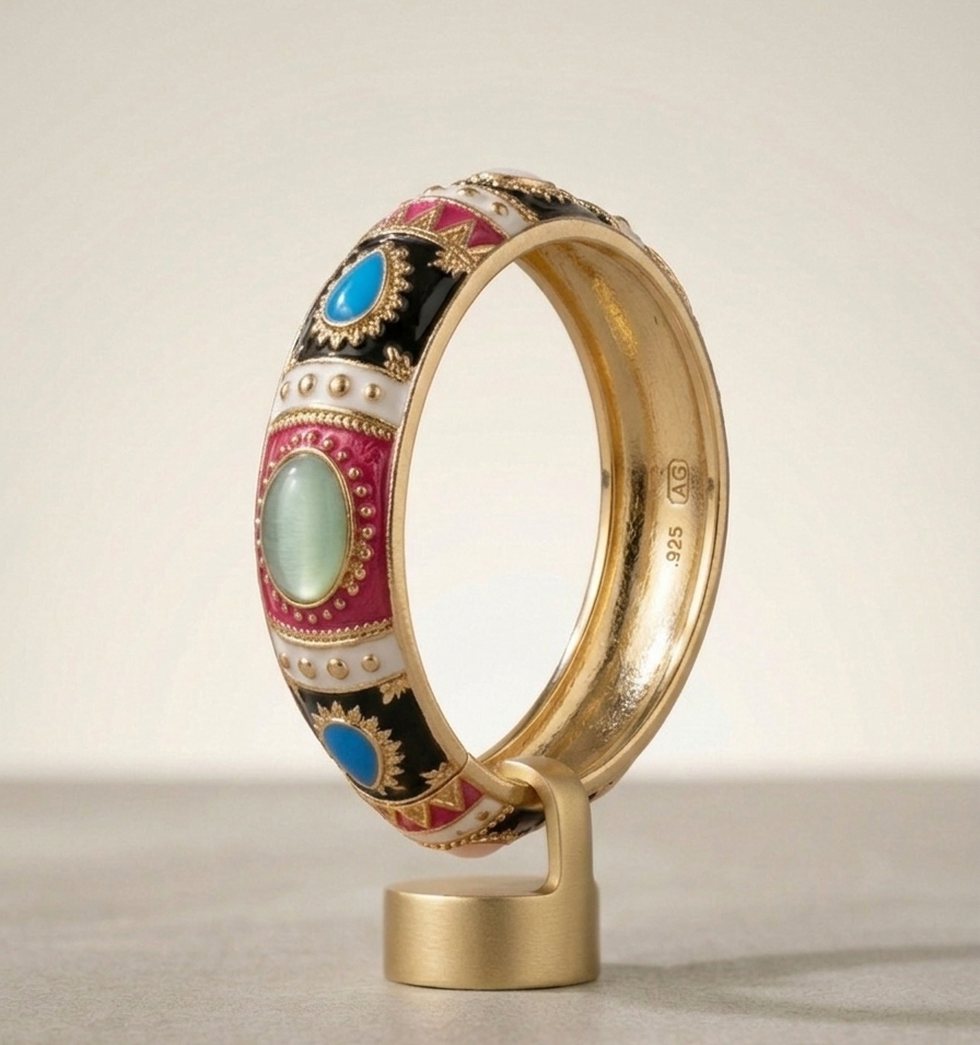 Luminous Jewel Tones: The translucent cabochons catch the light from all angles, adding a shimmering depth to the opaque enamel bands.