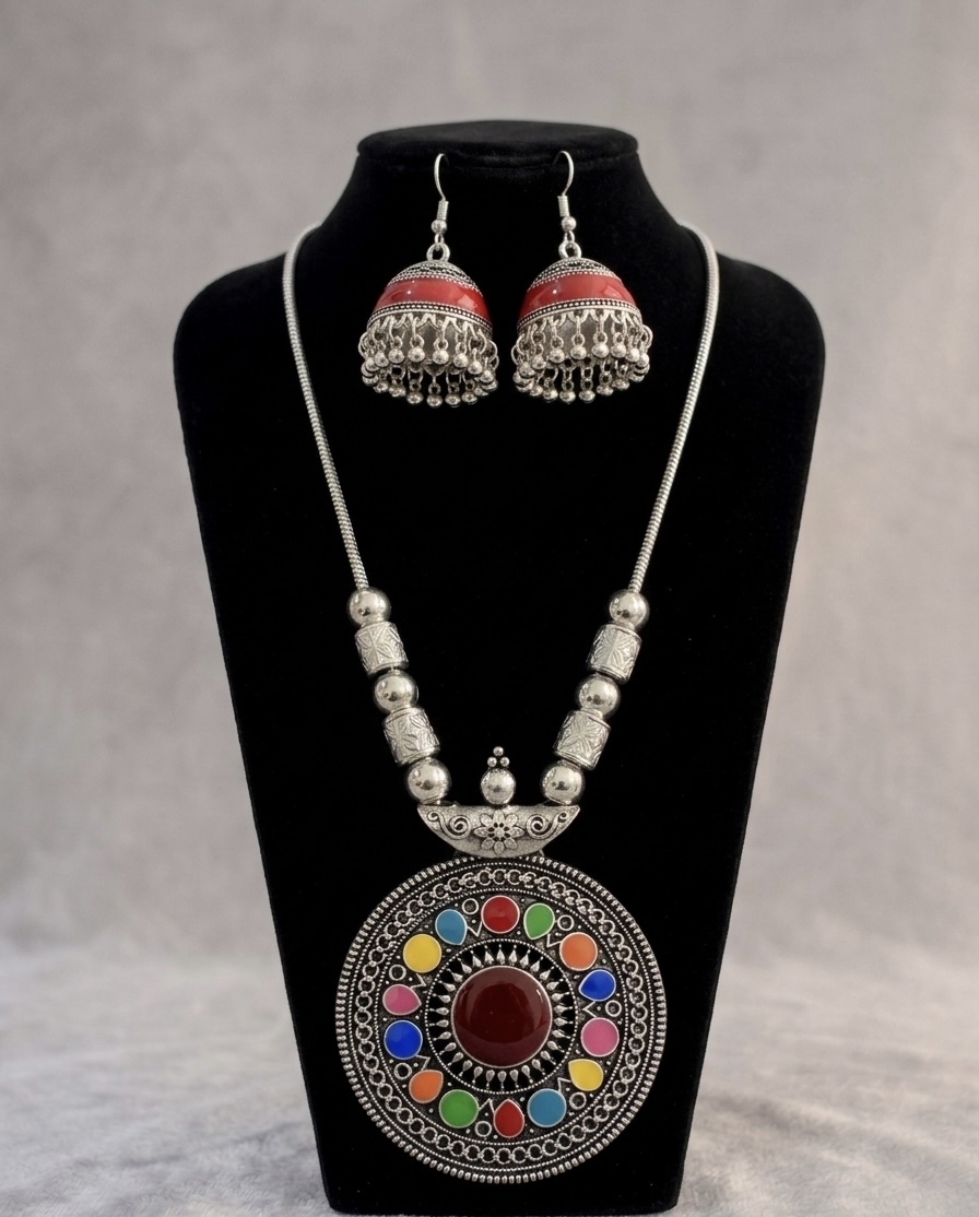 Celebrate the artistry of tradition with the Vibrant Mandala Enamel Statement Set. This ensemble is a true masterpiece of color and texture, designed for the woman who views jewelry as a form of self-expression. The centerpiece is a magnificent circular mandala pendant, where a deep maroon-red stone is encircled by a joyful palette of primary and jewel tones, all set against a richly detailed oxidized silver base.